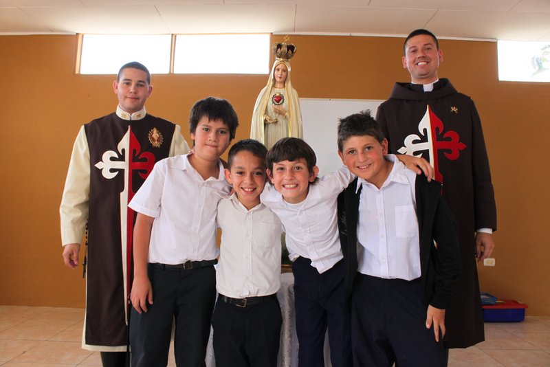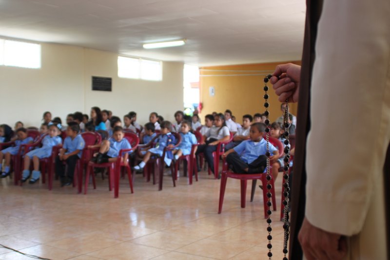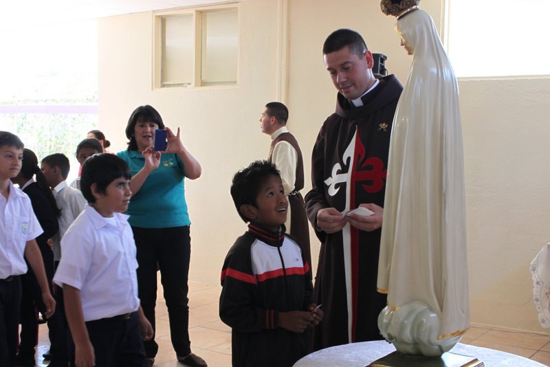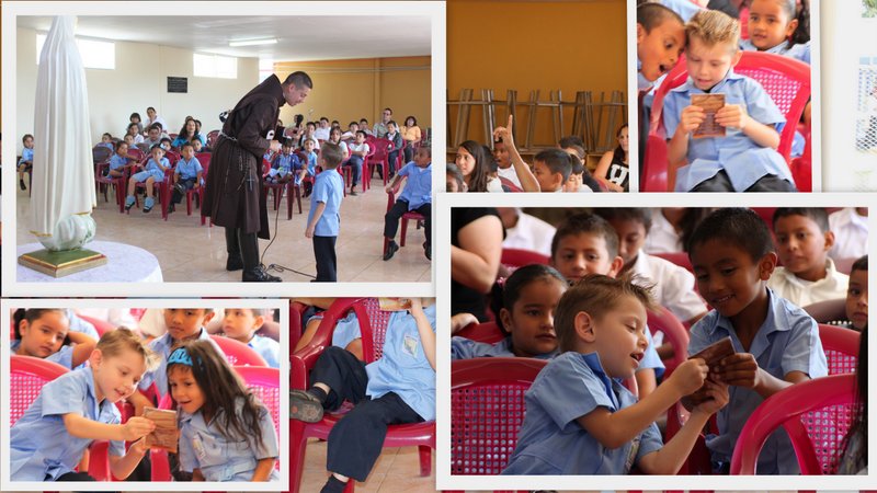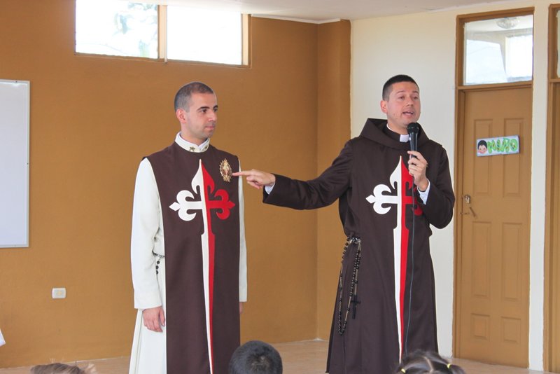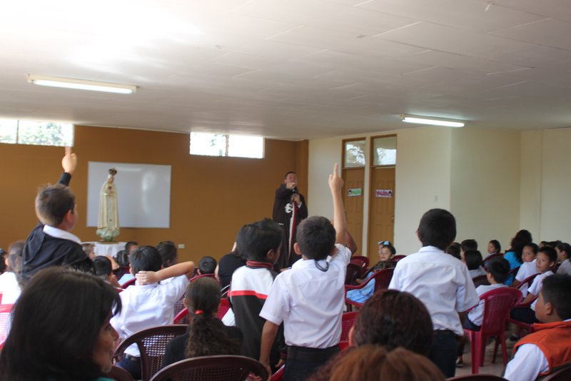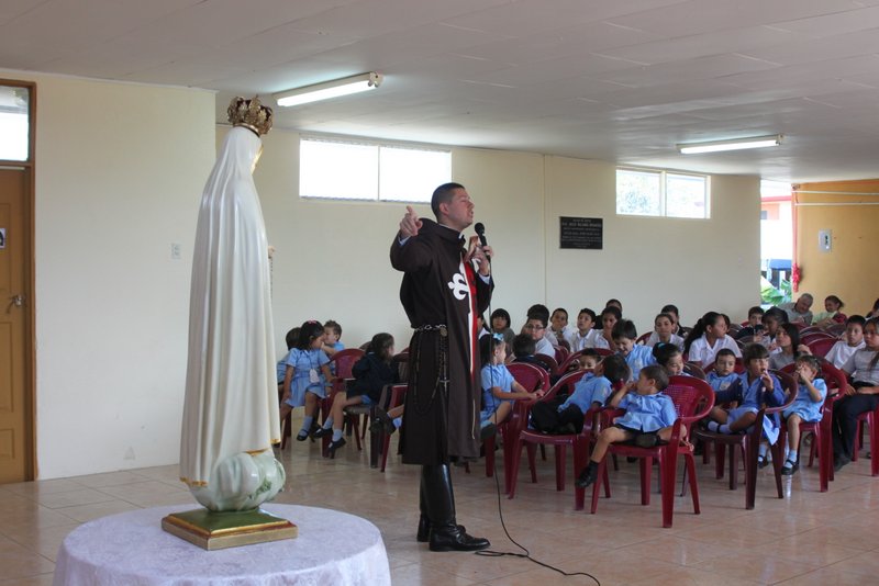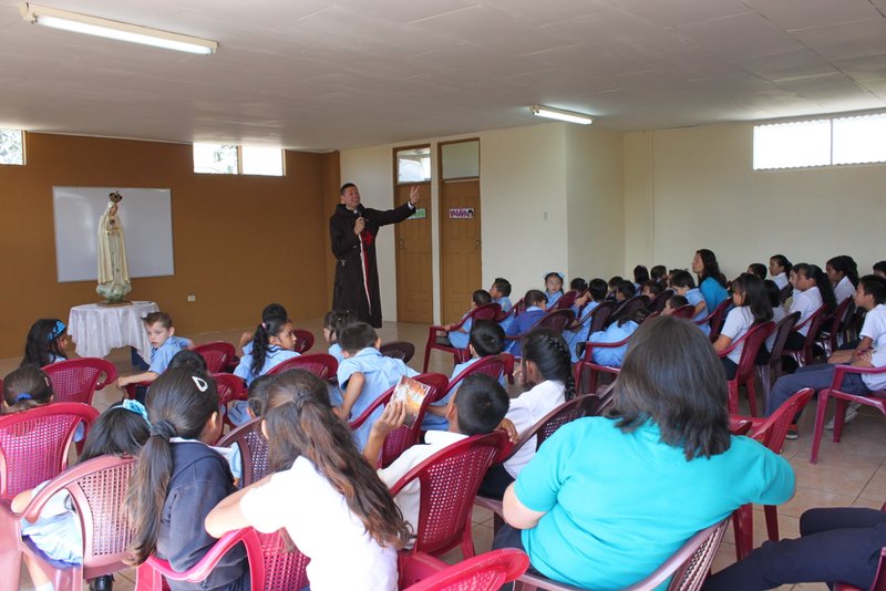 El Rvdo. Diác. Victor Jiménez explicó a los niños la importancia de la devoción a Nuestra Señora y en especial al Santo Rosario. De esta forma, motivó a los pequeños para rezar una decena en honor de María Santísima. Luego, les contó resumidamente la historia de los tres pastorcitos de Fátima y –ante las miradas curiosas de los pequeñitos- les explicó cuál es el carisma de los Heraldos y el significado del hábito que portan.