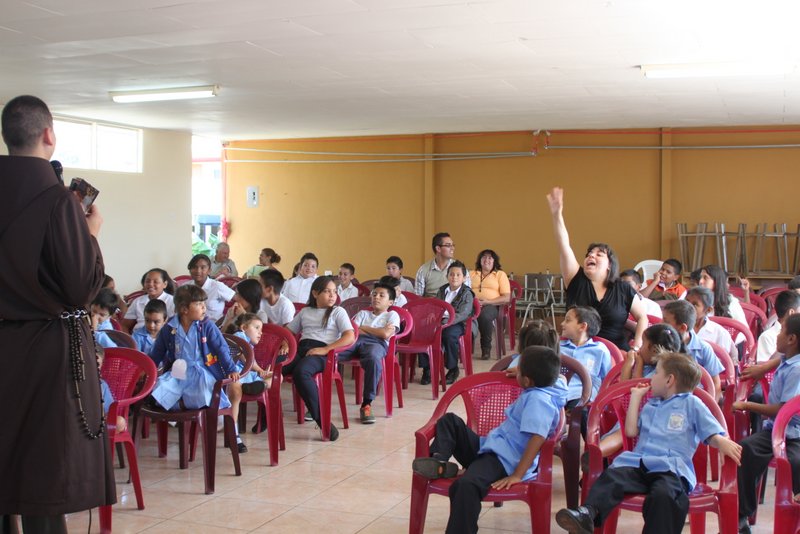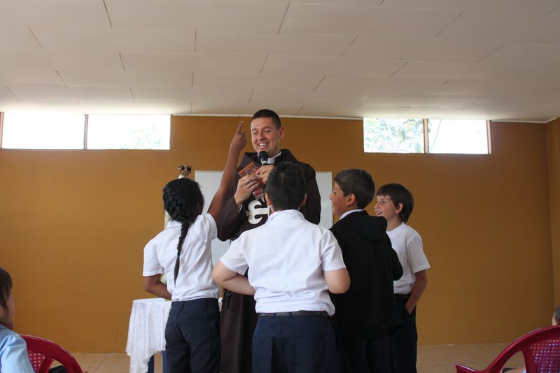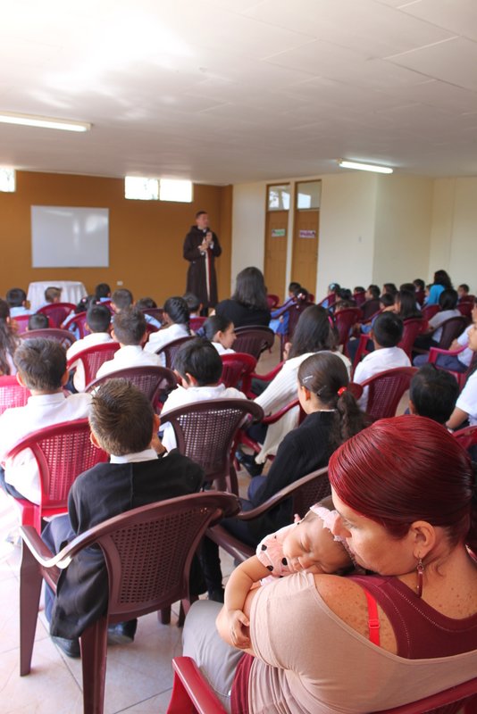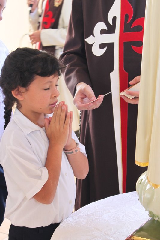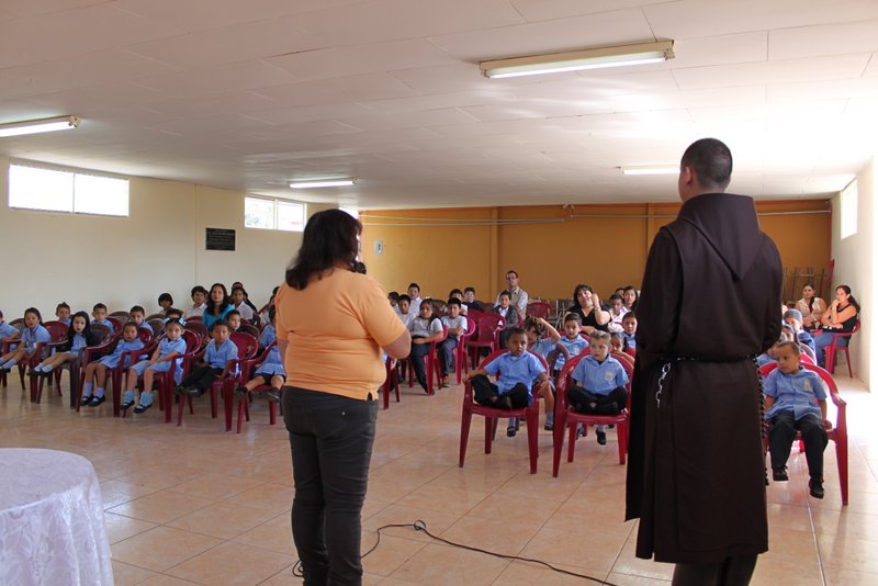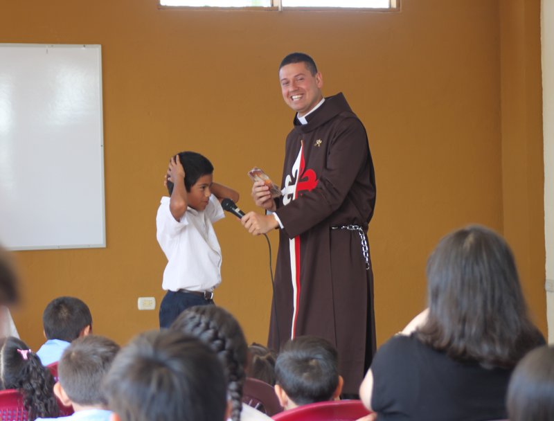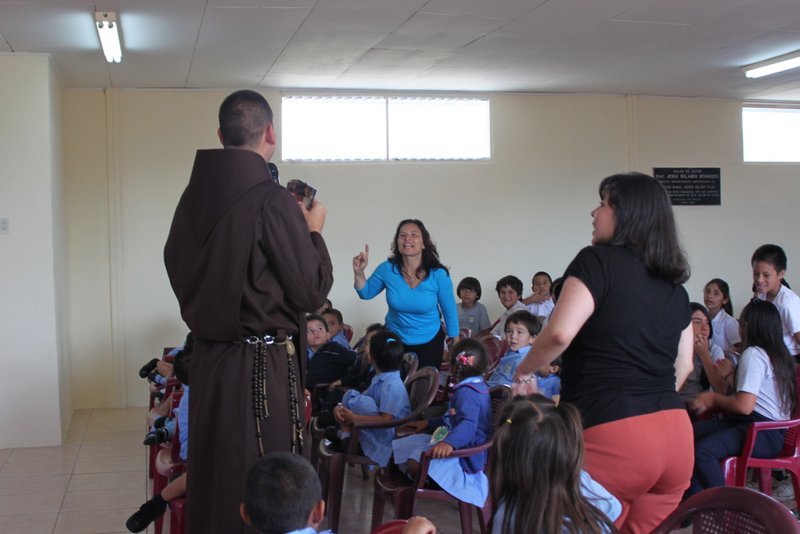 El Rvdo. Diác. Victor Jiménez explicó a los niños la importancia de la devoción a Nuestra Señora y en especial al Santo Rosario. De esta forma, motivó a los pequeños para rezar una decena en honor de María Santísima. Luego, les contó resumidamente la historia de los tres pastorcitos de Fátima y –ante las miradas curiosas de los pequeñitos- les explicó cuál es el carisma de los Heraldos y el significado del hábito que portan.