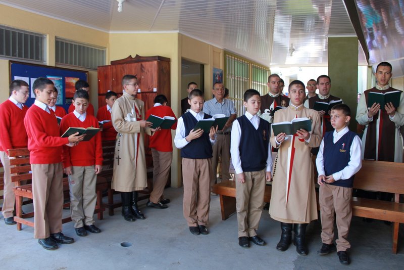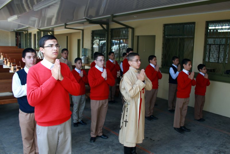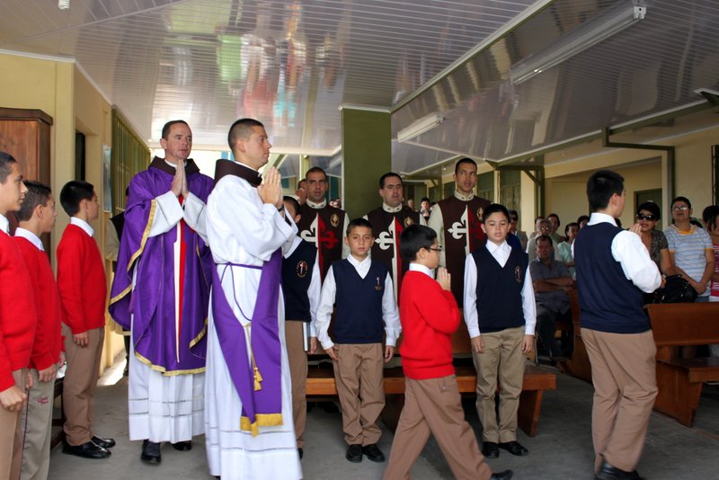 A las 08:00 hs. en las nuevas instalaciones del Colegio Heraldos del Evangelio Internacional, en San Ramón de Tres Ríos, para los alumnos del mismo, fue celebrada la primera misa. Con gran fervor los vecinos de la capilla también asistieron a la celebración. Unas 120 personas participaron de la ceremonia. Al estar el templo en arreglos, la misa fue hecha en el patio del colegio.